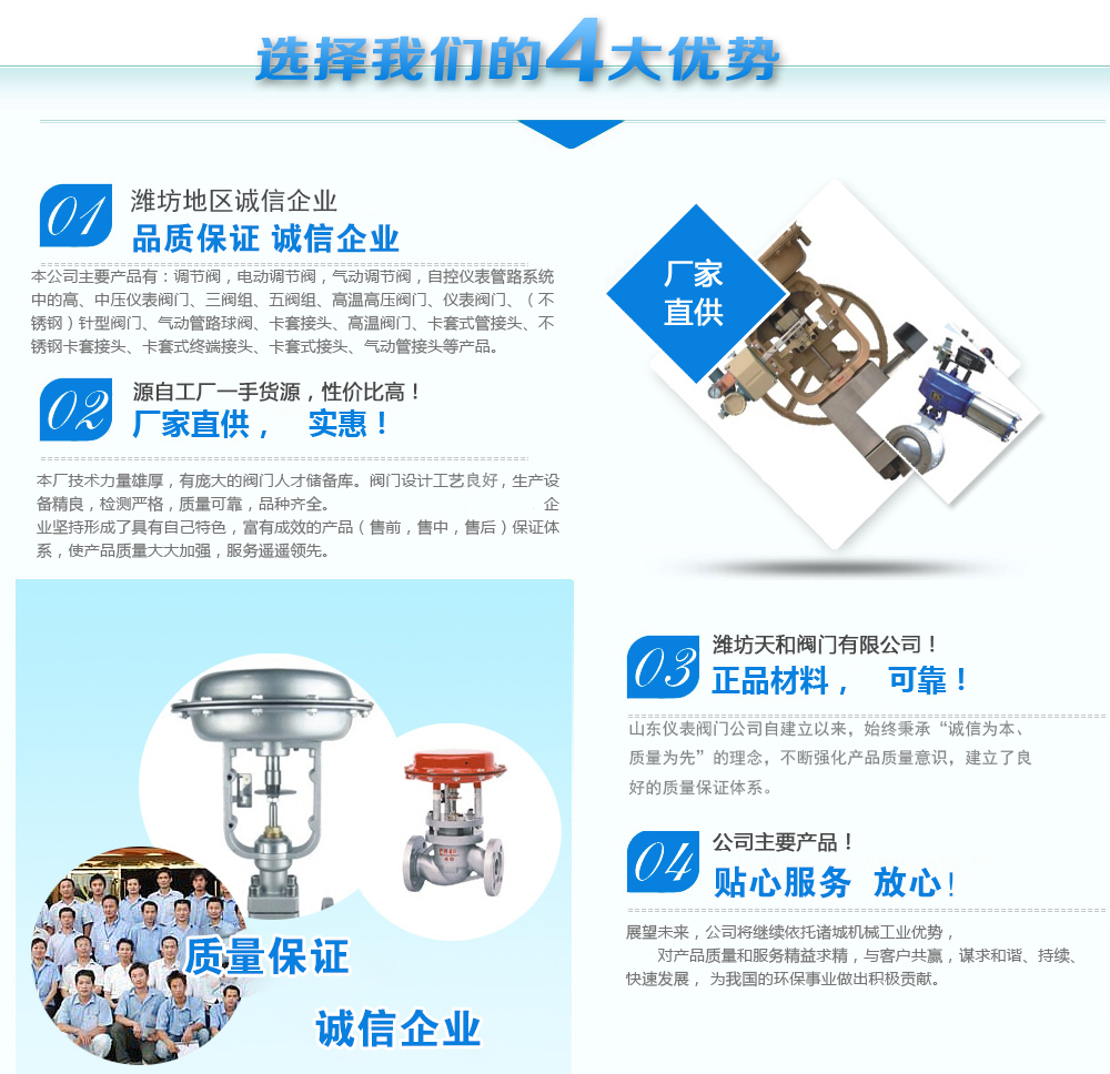 山東北特閥門科技有限公司座落于風景秀麗的世界風箏之都--山東濰坊,南鄰南濰坊國際機場。北接濟青高速公路,便捷,快速。本公司主要產品有:調節(jié)閥,電動調節(jié)閥,氣動調節(jié)閥,自控儀表管路系統中的高、中壓儀表閥門、三閥組、五閥組、高溫高壓閥門、儀表閥門、(不銹鋼)針型閥門、氣動管路球閥、卡套接頭、高溫閥門、卡套式管接頭、不銹鋼卡套接頭、卡套式終端接頭、卡套式接頭... [查看詳請]
